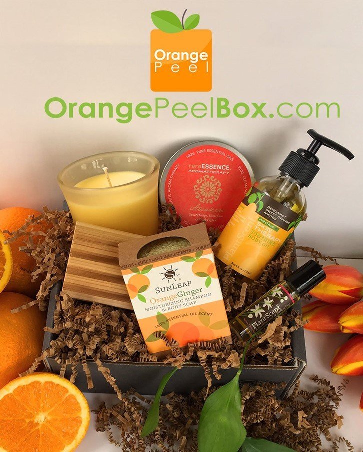 The full-size Orange Peel Box contains 5-6 luxury full size aromatherapy products delivered to your door quarterly.